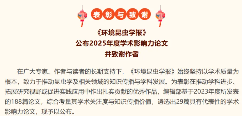 近日,《环境昆虫学报》正式公布“2025年度学术影响力论文”名单。云飞科技董事长周国涛与河南省农业科学院武予清研究员等专家共同撰写的综述论文——《昆虫趋光性研究的回顾》(发表于《环境昆虫学报》2023年第45卷第5期)光荣入选!